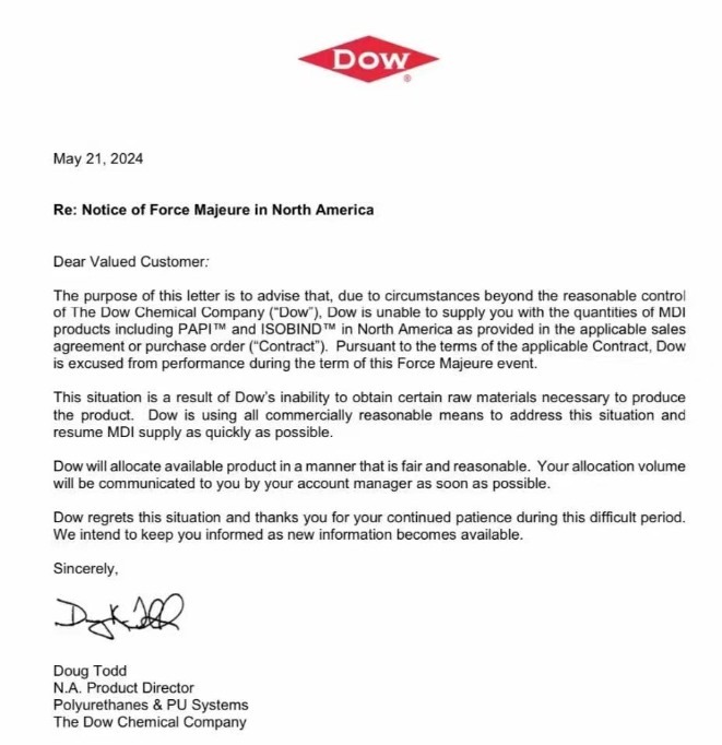 5月21日,陶氏发布消息,其美国Freeport的44万吨/年的MDI装置,因MDI因原料供应问题出现不可抗力。